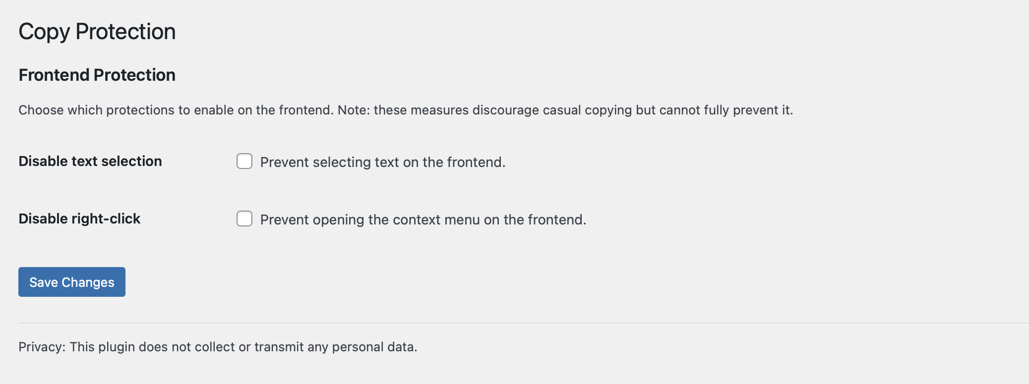 Divi Copy Protection Lite helps discourage casual copying by disabling text selection and/or right-click on your website’s frontend. It’s perfect for photographers, designers, portfolio sites, agencies, and anyone sharing original content who wants an extra layer of protection with zero setup hassle. Enable the options you need, save, and you’re done.