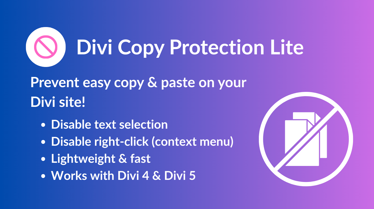 Divi Copy Protection Lite is a lightweight, Divi-friendly plugin designed to reduce “copy & paste” content theft by blocking text selection and the browser’s context menu on the frontend. It’s especially useful for creatives—photographers, artists, writers, coaches, and portfolio owners—who publish original work and want to make copying less convenient for visitors. The plugin is simple, fast, and easy to manage: toggle features from a dedicated settings page, with no trackers, no external dependencies, and compatibility with Divi 4 and Divi 5.