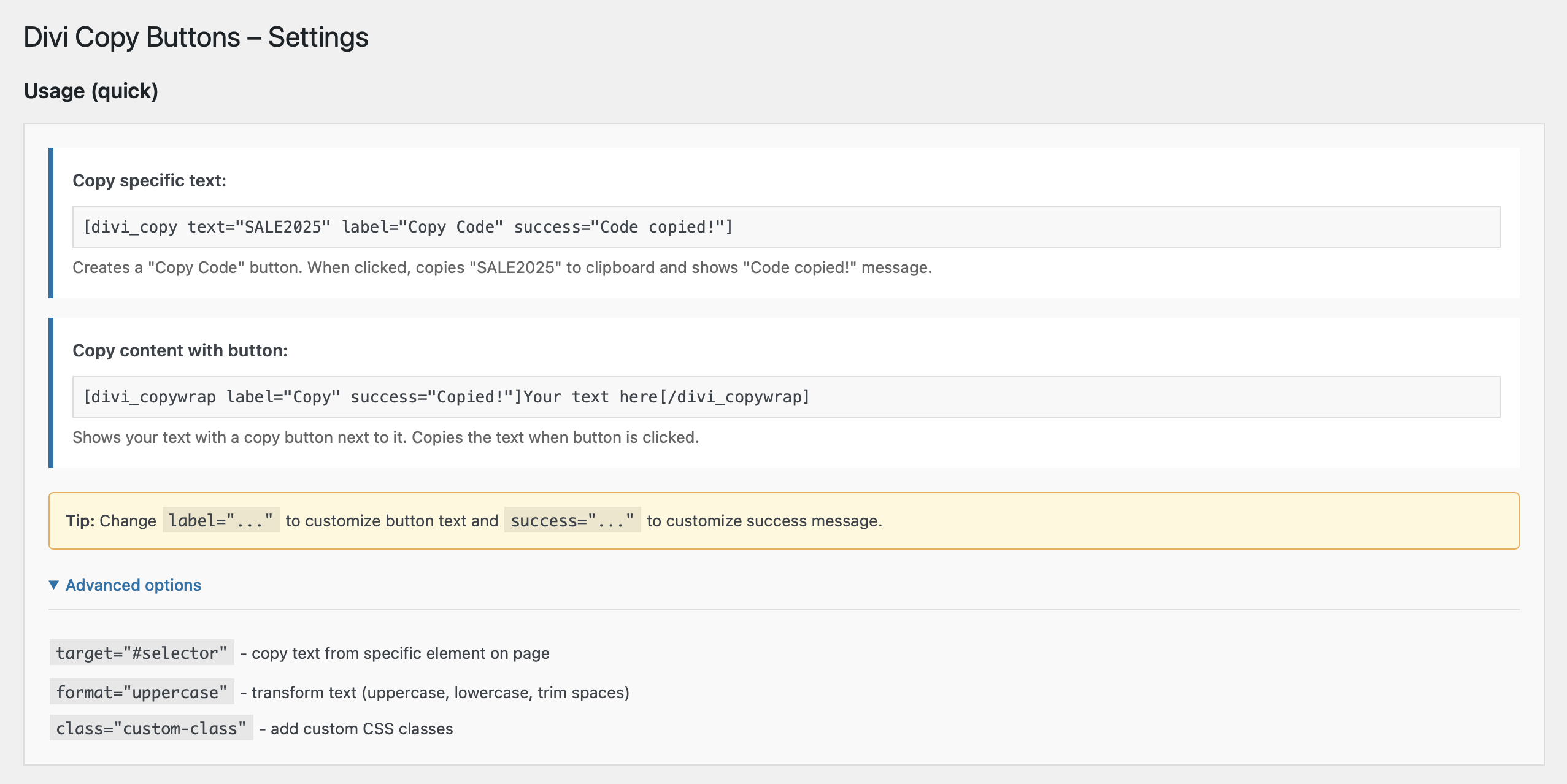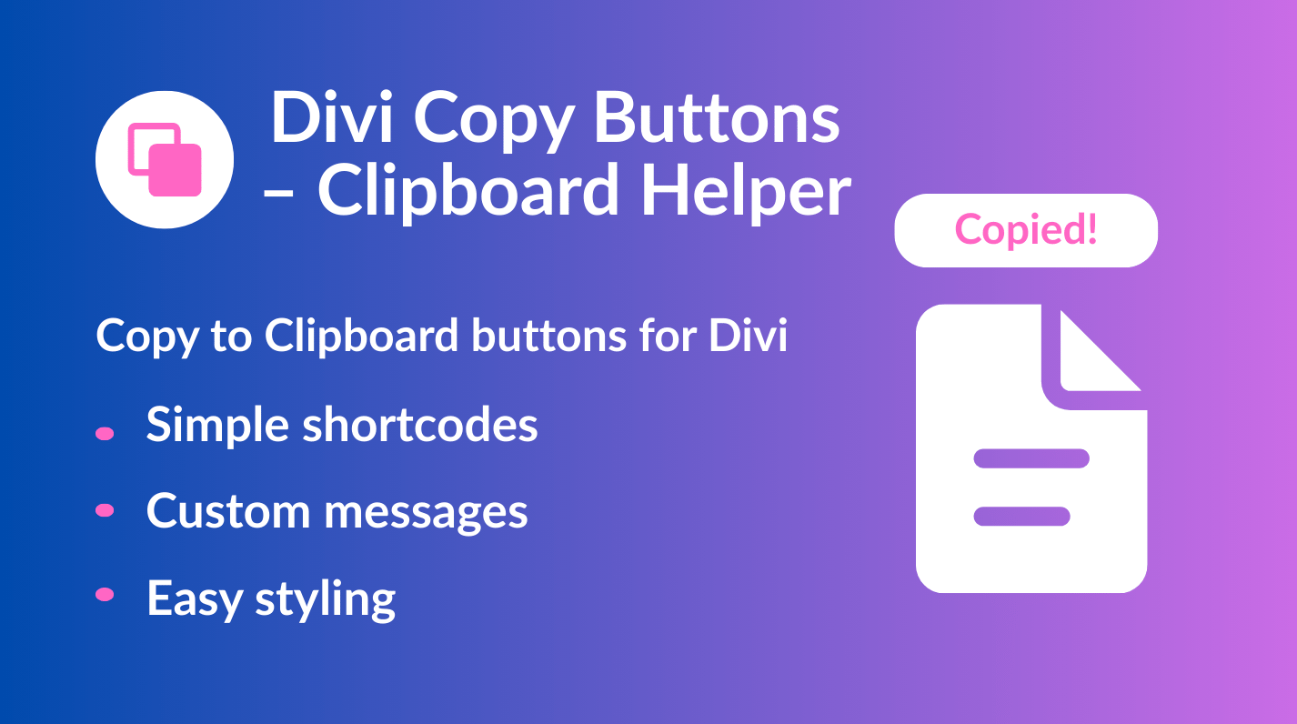 Add clean, accessible “Copy to Clipboard” buttons to Divi with simple shortcodes or a CSS class. Lightweight, customizable (including hover), and translation-ready.