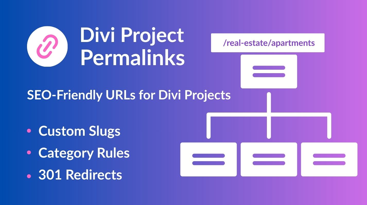 Divi Project Permalinks lets you build clean URLs for Divi’s Project post type based on the primary category (supports Yoast SEO “Primary category”) or a custom base (slug) defined via rules. Set a default base, add per-category rules, and keep rankings intact with optional 301 redirects when structures change.