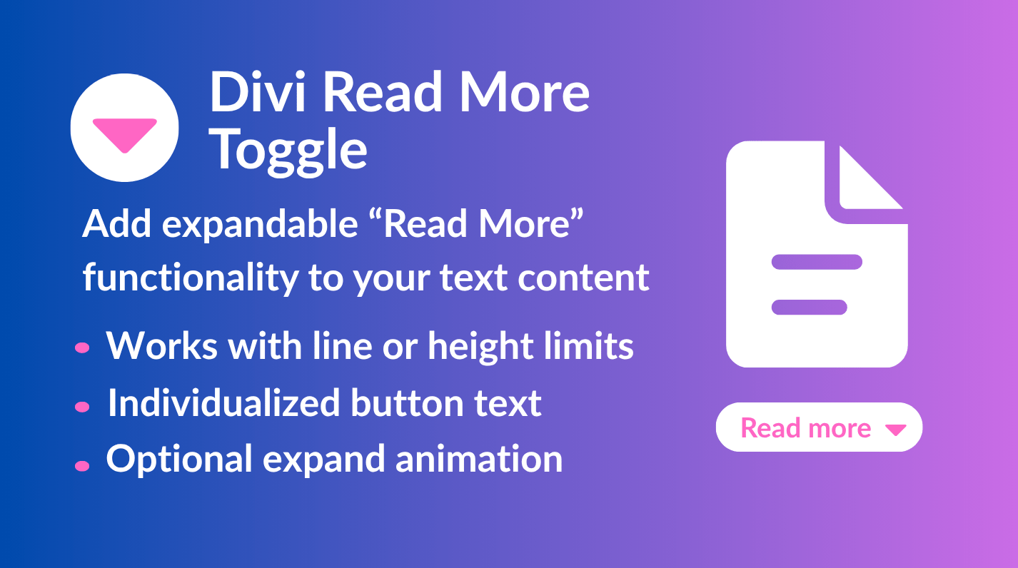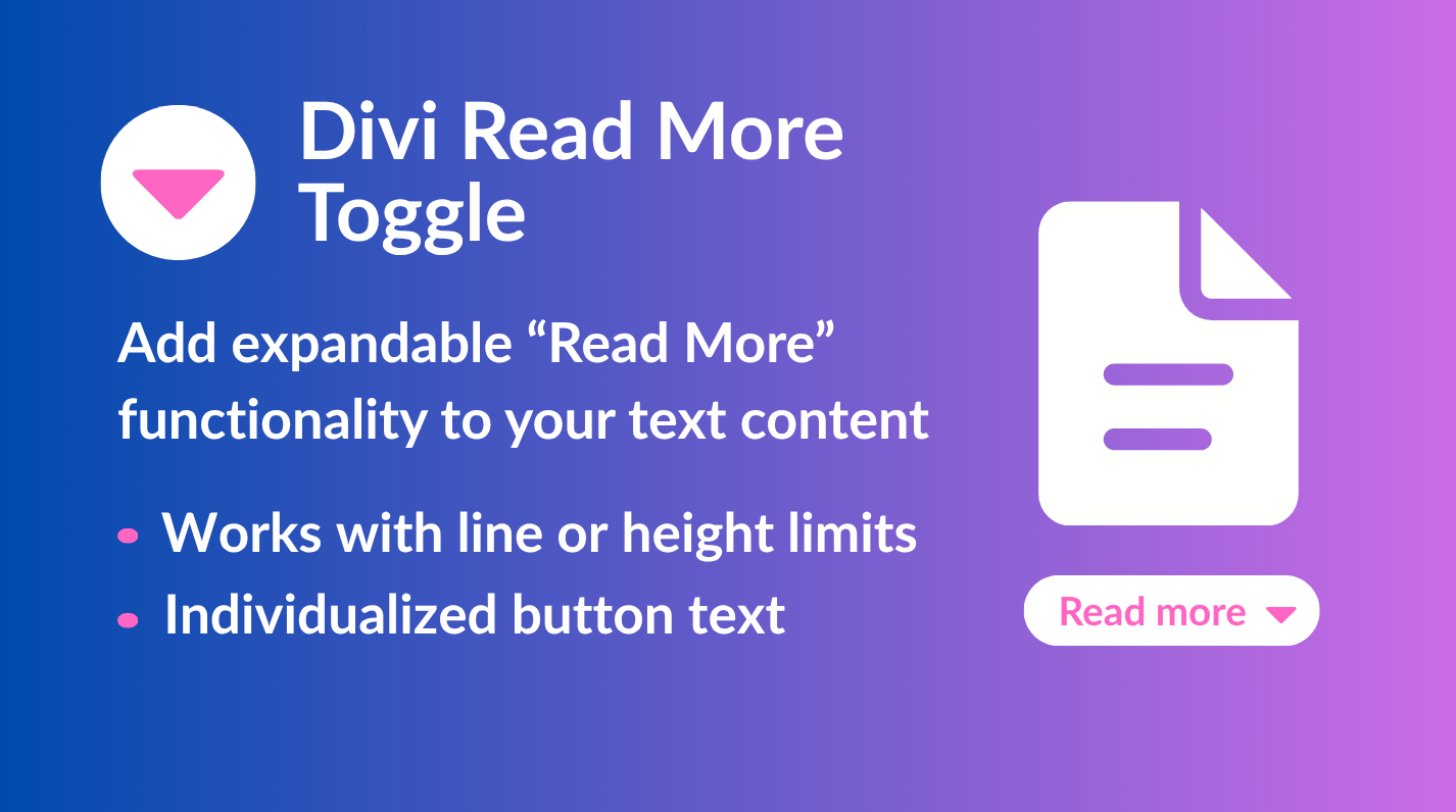 Divi Read More Toggle is the simplest way to keep your Divi layouts clean and professional while still showing all the content your visitors may want to read. Instead of overwhelming your page with long paragraphs, you can add a sleek Read More / Show Less button to any text module with just a CSS class.