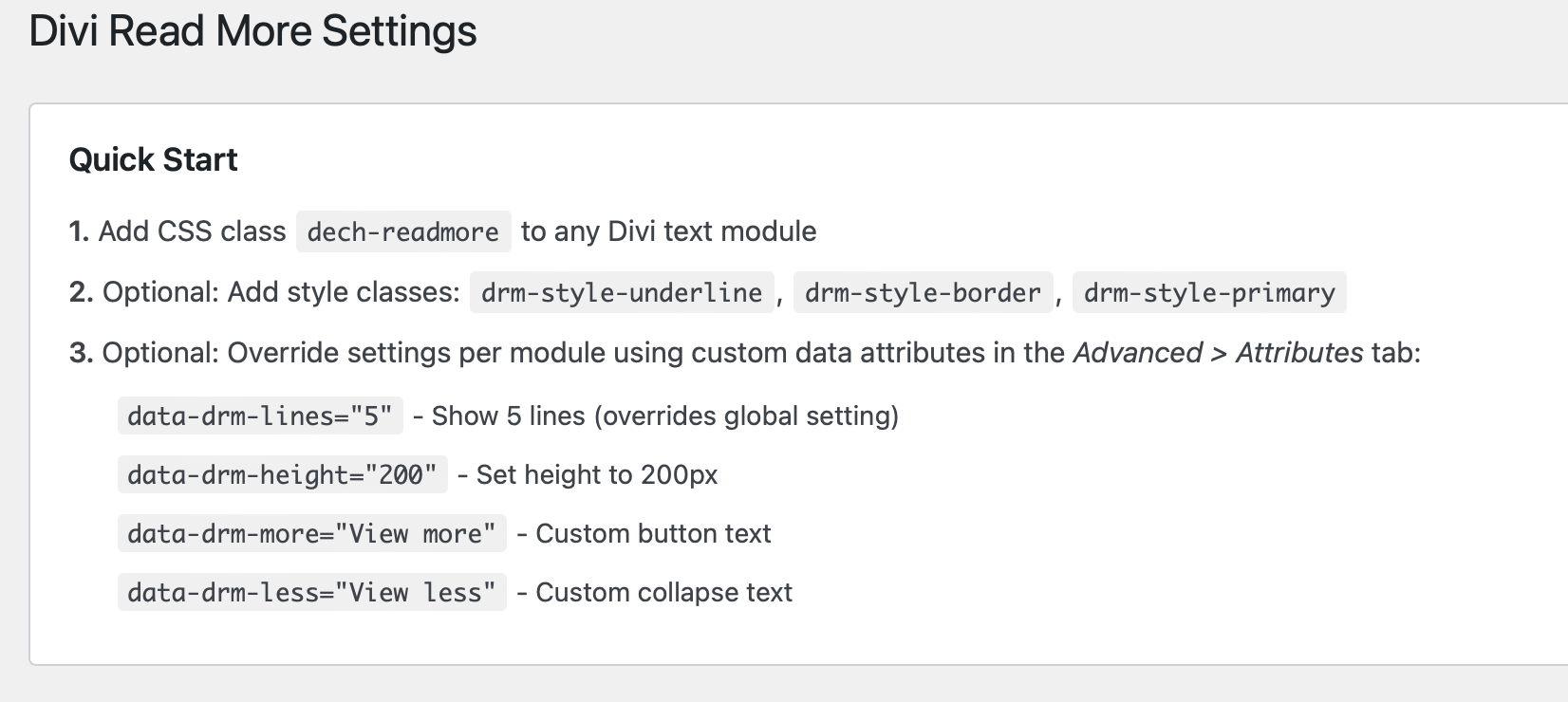 dech-readmore - (Optional) Add custom attributes like: