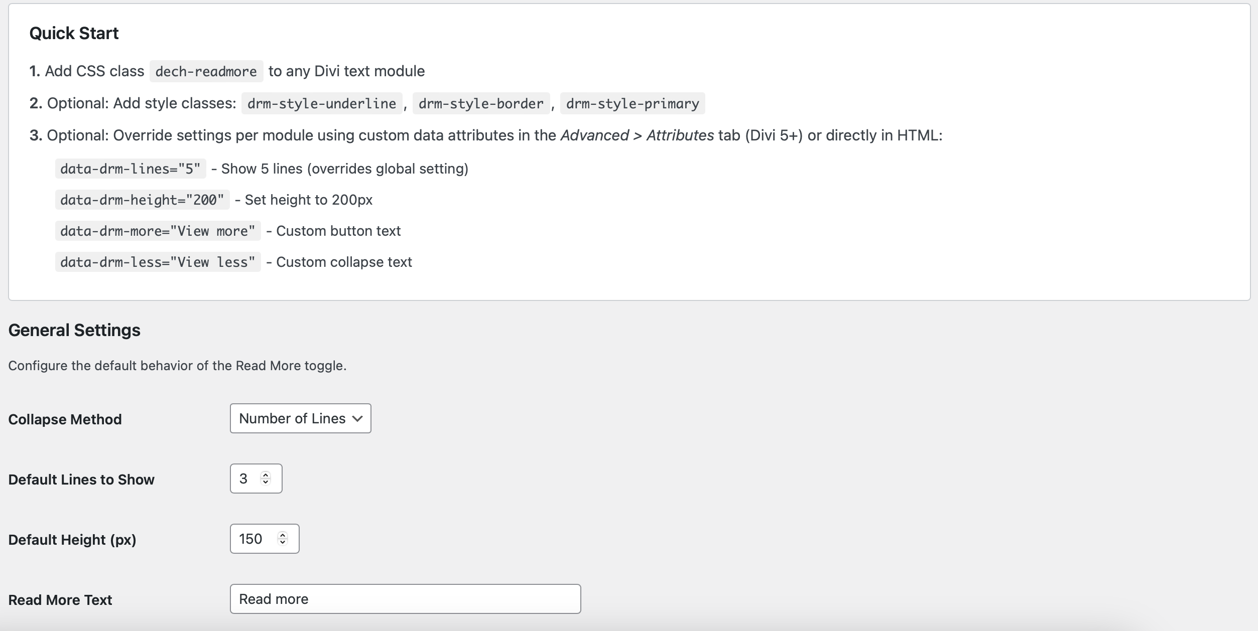 Easy setup – just add the dech-readmore class to any Divi text module.