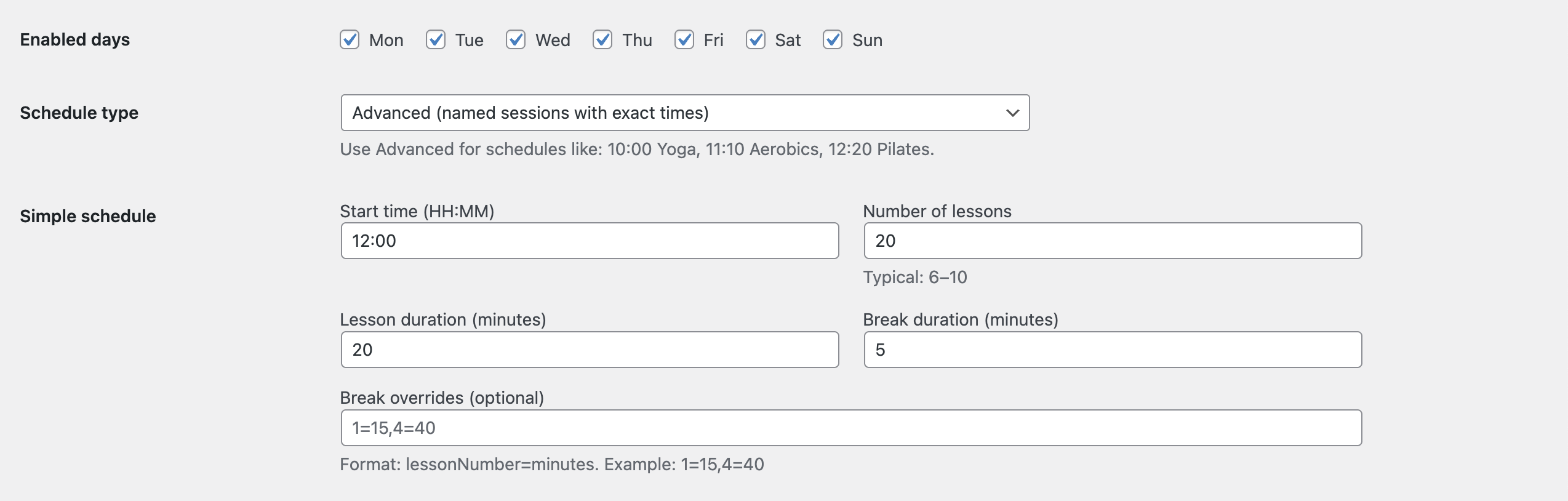 • Schedule: set start time, lesson/session length, breaks, and enabled days