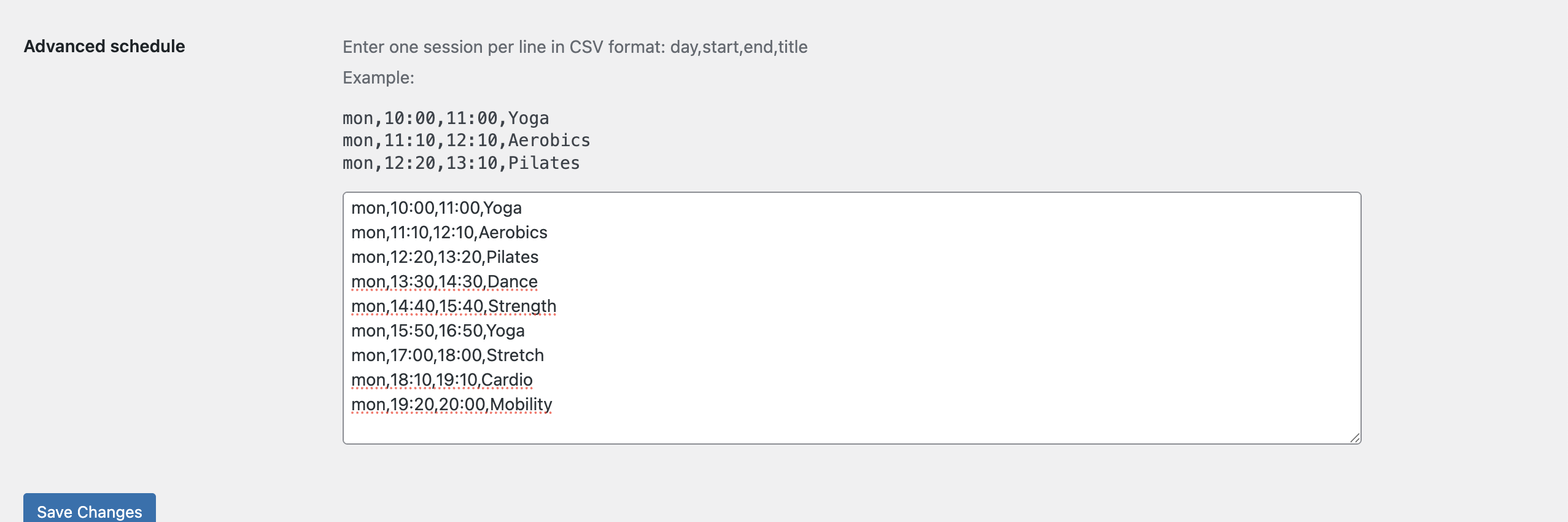 Have different sessions throughout the day? Use Advanced schedule to add named sessions like Yoga, Aerobics, Pilates, and more.